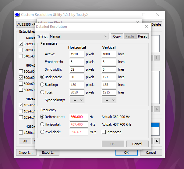 (05-06-2021 08:40 AM)ToastyX Wrote: First, you didn't read the information in the CRU post. Second, why are you trying to add a resolution that already exists by default? I don't understand what you're trying to do. It does the same thing when you change it to 1650x1080p. It wont let me do it bc the frames when i put it at 360hz the applications turns red like trying to tell me i cant play at my 360fps refresh rate. |
