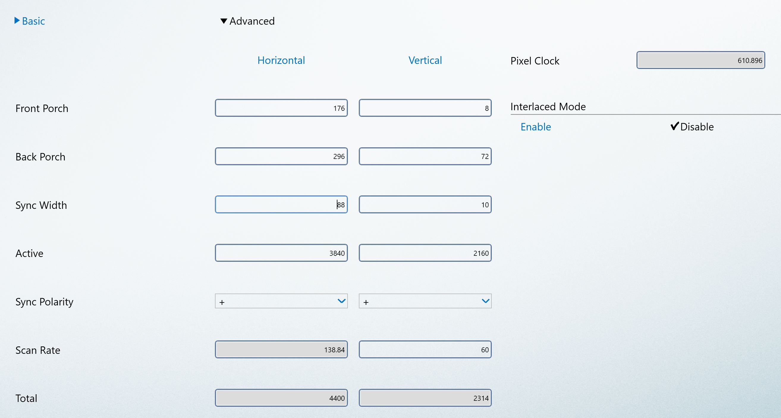 Thank you for that. I will try it and see what happens Ok so I tried it. No joy. I get the dreaded "the custom resolution exceeds the maximum bandwidth capacity" Another thing I noticed is that the Intel custom resolution utility seems to be adding a value somewhere. Taking a look at the screen clip you'll notice that the total on the vertical column does not add up. It is adding a value of 64 somewhere. If I play around with it and put a generic value of 100 in the back porch, the total is now off by 92. I don't know what is going on with this. In any case, I reduced the back porch number to 40 to get 594 MHz and I still get the maximum bandwidth capacity error. So now I am fairly sure I am running into a driver limitation, or a hardware/BIOS limitation. I have read of instances were the manufacturers were specifying a maximum CD CLOCK (?) value in BIOS that cannot be changed. Not sure if I am running into that issue here or not. Thoughts? |