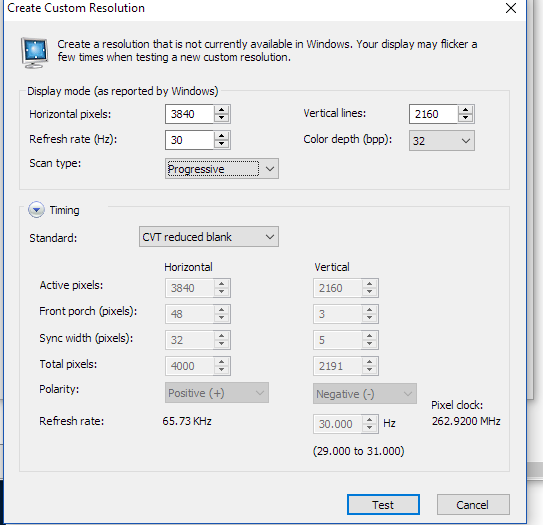 I have a 2009 Macbook Pro with an NVIDIA GeForce 9600M GT with mini DisplayPort. I installed an SSD and Windows using BootCamp and use it as my regular work computer. I just bought a UHD TV and tried to hook it up as a monitor. I do database design work and it helps to have a huge screen. Using an AmazonBasics mini DisplayPort to HDMI and an AmazonBasics high-speed HDMI cable, I plugged it into the Samsung OneConnect box for PC/DVI. That worked fine for 1920 x 1080 output. In the NVIDIA Control Panel, I created a custom resolution for the Samsung of 3840 x 2160 @ 30Hz which I then selected in Change Resolution and voila! it worked. Or so it seemed. As soon as my main laptop screen turned off (screen saver, sleep mode, etc), I could not get it to turn on again until I unplugged the cable to the (also dark) TV. This is the problem I tried to resolve for days. The only way to get the TV to show anything and not turn the laptop screen black was to uninstall and reinstall the NVIDIA driver. Through googling, I read a lot about EDID and tried other utilities and then made my own override with an INF file, with Native resolution of 3840 x 2160 @ 30Hz. Didn't work. Once I had found CRU, I started to get a better understanding how the monitor profiles were managed. I deleted my override by resetting all profiles. I noticed that a profile was being created automatically for the TV with two Detailed Resolutions: 3840 x 2160 @ 30Hz and 1920 x 1080 @ 60Hz. I deleted all of the sub-HD resolutions and saved it. The 4K resolution would not show up in Windows Settings and all of the sub-HD settings would still appear. After trying this several times with small variations in the settings (60 vs 30Hz, interlaced vs non-interlaced, etc) without success, it occurred to me that Windows may not be showing the 4k resolution because the NVIDIA driver is not telling it that it can handle it. So I created a custom resolution in the NVIDIA Control Panel and took a screen shot of all of the settings. I opened CRU and modified the 4k settings of the monitor profile to match. I restarted, connected the TV, went to the Windows Settings. The resolution for the Samsung now included 3840 x 2160 (Recommended) in addition to the 1920 x 1080. None of the lower resolutions appeared any longer. Sweet success. I don't know if I could delete the custom resolution from the NVIDIA Control Panel now and it would still work. In any case, getting the exact output settings and using CRU to modify the profile was the key to making this work. |