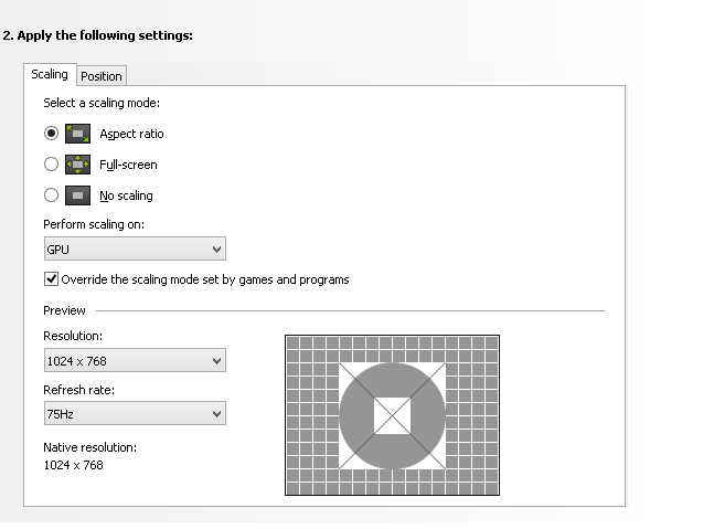 I can't get black bars somehow, i got 1024 x 768 ingame and i got Aspect Ratio ticked in NVIDIA Control Panel aswell as GPU scaling. I've also got "Override the scaling mode set by games and programs" ticked on. Having it ticked off makes no difference for me.