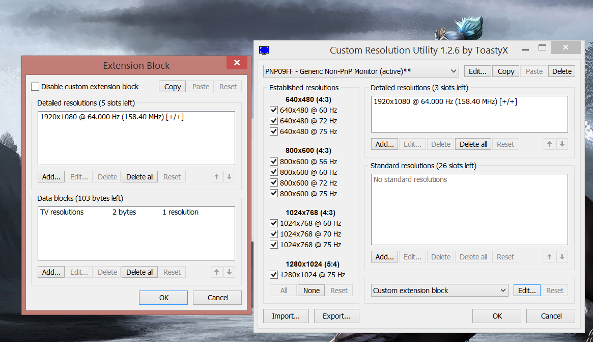 I would appreciate your help - I upgraded to windows 8.1 and my computer resolution, like many people here, is messed up. I used to be 1920x1080 on my windows 7, but now the maximum it lets me to do is 1600x1200 and it looks horrible. I see that most people post their specs so I hope these are correct (I took them off Speccy): OS: Windows 8.1 64-bit CPU: Intel Core 2 Quad Q8200 @ 2.33 GHz RAM: 4.00 GB Dual-Channel DDR2 @332 MHz Graphics: Generic Non-PnP Monitor (1600x1200 @64 Hz) NVIDIA (with microsoft basic display adapter) I am using CRU 1.2.6. I have tried to use your programme to my best understanding but I worry I have done it wrong so it doesn't change anything. I selected the monitor and did a detailed resolution to 1920x1080 @64 Hz and added a custom extension block that I edited to have 2 data block bytes left. I then restarted the graphics card and tried to change my display resolution in settings but it now only has one option 1600x1200 with no change (it had 3 options before). I attached a picture that may be more helpful than me rambling on and trying to explain what I want. Please let me know if it's something I have done wrong or if I need to do something in addition. Please help!