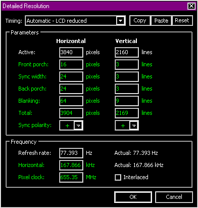 (03-09-2017 11:38 PM)ToastyX Wrote:(03-08-2017 05:01 PM)lefenzy Wrote: I have also tried putting the parameters for 960x720@75Hz from the CRU Detailed Resolutions dialog into the Intel graphics driver Add Resolution (Advanced). This makes the resolution show up among the possible options, but the monitor complains about unsupported timing when I try to use that resolution.It's possible the monitor won't accept 960x720 @ 75 Hz even if it accepts 75 Hz at other resolutions. If the monitor won't accept standard timing parameters, then it's trial and error figuring out what will work. I gave up on a custom resolution at higher refresh rate, but I have found the U2414H monitor is capable of 1920x1080 at 76 Hz max. Funnily enough, when I tried 77 Hz or 78 Hz in CRU, after restarting the driver, those refresh rates were not available to set in the display settings. I was using LCD reduced settings. |