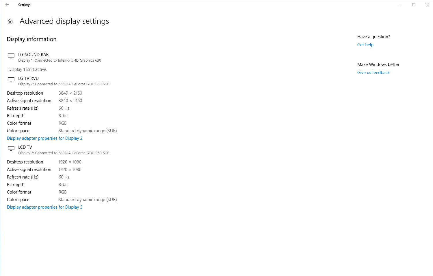 I have a strange problem that I think your tool will resolve, just not sure which tool to use. I run Windows 10, NVIDIA GeForce GTX 1060. I'm doing duel monitors one at resolution 3840x2160 and the other at 1920x1080. Those 2 are set correctly, yet the problem is for some reason Windows is reading my soundbar as a display. Display #1 is my soundbar, #2 is my 3840 and #3 is my 1920. I need somehow to get rid of the 3rd display #1 that is actually my soundbar. The soundbar works through Bluetooth, but not through HDMI because it's reading incorrectly. Also on this bogus display #1, the Active Signal Resolution is reading 4096x2160, yet the Desktop Resolution is reading 1920x1080, so it's causing not just a problem with the soundbar, but a problem with the second display #3. I'd disconnected #1, but what I really need is a way to delete this display setup altogether. That way I can get my soundbar to work with HDMI and would solve the resolution problem on my second display #3. Also, deleting this display would solve my problem with my Intel Optane Memory, which is caused by this soundbar display. You can see from my screenshot, this bogus display is connected to Intel UHD Graphics 360. Can you software do this? If so, which one should I use? I've added a screen shot of my display setup. I appreciate any and all advise you can give. Thanks for what you do. |