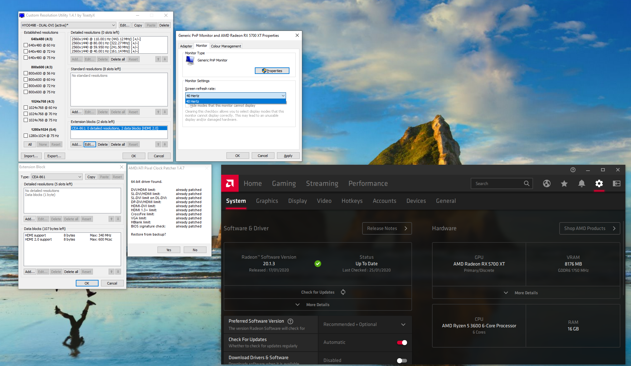 I've been working on getting my QNIX 2710 without scaler connected to my new graphics card (RX 5700XT), but so far only managed a 40Hz connection via Club3d HDMI to Dvi-D cable: https://www.cyberport.de/pc-und-zubehoer...-1210.html On my previous RX 480, I got 110Hz. The cable claims to be able to transmit UHD / 3840 x 2160 @ 30Hz. So I guess the problem is the graphics driver still having the HDMI-DVI limit in place, even though I used the patcher for this. Any ideas of what I could try? I have included a screenshot of all my settings and driver info. Thanks for all the great work! |