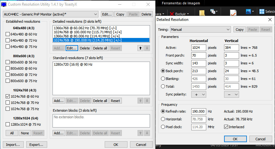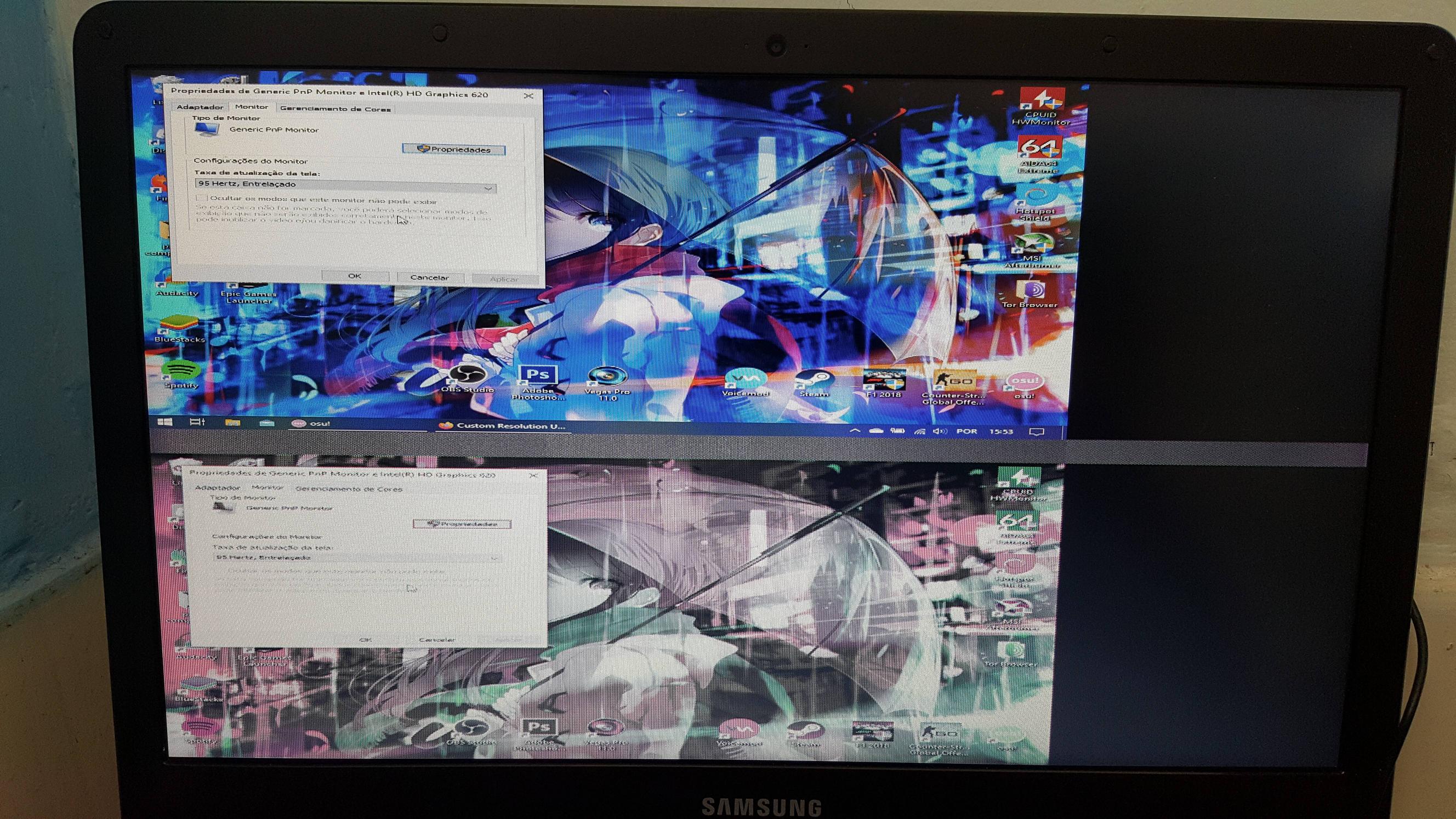 I tested this software on my laptop, a Samsung NP300E5M, native resolution 1366x768 @60hz, tweaking some configurations on this software i manage to achieve 80hz on the native resolution, without any frameskip and with a very very low ghosting(almost inperceptible). But lowering the resolution to 1024x768 I manage to get 100hz, without frameskipping again. Which is very nice to me(i use this setting to play osu!, the "playable area" on the game already is a 4:3 aspect ratio area, so I dont lose anything lowering to this resolution, and on top of that, get a massive improvement on the gameplay thanks to the higher framerate). So i decided to go further and with interlaced framerate 1024x768i I achieved 190hz (95hz interlaced, it got veeerrrryyy smooth ultra nice hahah) but I dont know what happens on this setting my screen gets a duplicated image, everything still readable... Its like my monitor display the same image 2 times one on top of the another, the first image looks ok but gets cramped on a corner of the screen, the second one looks like crap. This happen with every interlaced resolution that I set up. CRU settings(1024x768i @190hz): How it looks like at 190hz(interlaced): How it looks like at 100hz(looks perfect! with a weird left offset but i dont care, at 60hz the image gets centered on the screen): There is possible to do something to solve this? I hope you guys can help me. Thanks! Greetings from Brazil. |