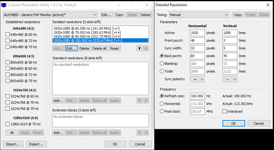 (10-30-2020 05:18 AM)botounacruzeta Wrote: As a side note, I noticed when I import these settings (that should be the default ones) and restart the GPU, CRU shows a "*" to the right of the monitor name, meaning (at least I think so) the current settings are not the default ones.....but they are.That's not a problem. CRU always sets certain bits a certain way, so that may be different than the default. That shouldn't break the NVIDIA control panel. What happens if you delete the vendor-specific data block from the extension block? Another thing you can try, install this: https://www.entechtaiwan.com/util/moninfo.shtm Run reset-all.exe and reboot. Then run MonInfo and create an INF file. Then install the INF file using the instructions here: https://www.monitortests.com/forum/Threa...-inf-files That will install an EDID override with absolutely no changes. If that breaks the NVIDIA control panel, then that means simply the presense of any EDID override is triggering the problem, not necessarily the content of the EDID override. Attach the INF file created with MonInfo so I can see what differences there are. |