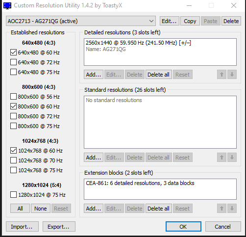 In CRU, I made a new Detailed Resolution - 2560 x 1440. It worked the very first time. After that, it does not work. When I reboot, I'm sure the computer restarts normally except the screen stays black. I booted into Safe Mode, ran the "reset-all.exe" to clear it, then the computer works normally again. But, of course, the custom res is not available. I've tried it several times with the Timing set to Manual, Automatic(PC), CVT-RB2, Exact, and Exact reduced. Same results for each one. Any insight would definitely be appreciated. |