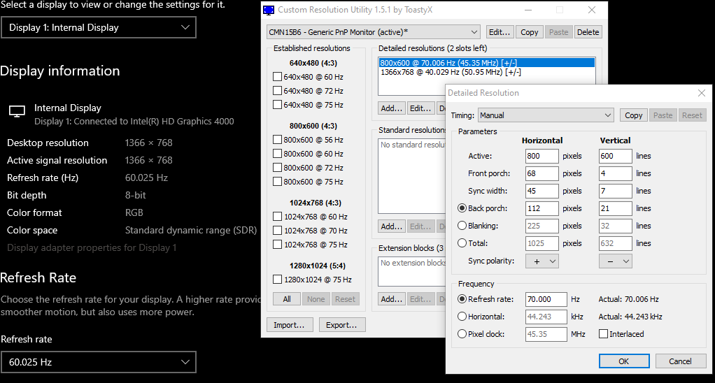 Thank you very much for your free software! I have a HP pavilion m6 1060sl (Intel 4000 + AMD Radeon HD 7670M) notebook with i5-3210M. Since it is an old Intel generation, I did what is written in the section "Alternative method for Intel GPUs" about the EDID installer. Then I tried both increasing and lowering the resolution, also changing the refresh rate but nothing happened. In the attached picture I've just edited the first default Detailed resolution changing it to 800x600 and changing 60 to 70Hz, then I run both restart and restart64, even restarted the notebook but nothing happened, am I doing something wrong? Thank you very much |