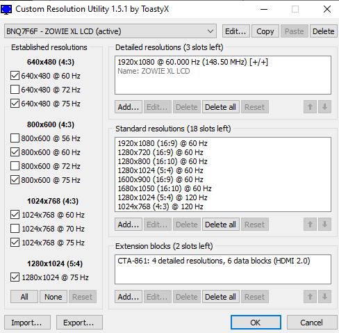I've been using CRU almost at a year and I need to say that is a great software, but I found one problem with my configuration: I recently bought an AOC CU34G2X/BK monitor, which is 3440 x 1440 resolution and has 144 hz of refresh rate. The thing is that I want to create a custom resolution (with another refresh rate, something like 140 hz) cause I'm experiencing some micro stuttering in games (like Resident Evil 2 and 3 remake) and I tried various possible solutions with negative results, but I saw one post on one guy posted that creating another refresh rate below the maximum of his monitor did work for him, so I want to try it too. The fact is, as you can see in the image, CRU is detecting my monitor with two differents refresh rates: 60 and 100, and the monitor is 144 hz (is connected to my GPU with the original Display Port that comes with the monitor, with which can reach 144 hz) and even Windows is detecting it as a 144 hz monitor as you can see in the image too... I can configure the games as 144 hz too. I tried to edit the resolutions and I can set it at 120 hz at maximum but I can't understand why is CRU detecting it as 100 hz monitor. I'm very confused with that, and I don't know if I misunderstanding something about CRU, so I need a little help with that. Thanks in advance. |