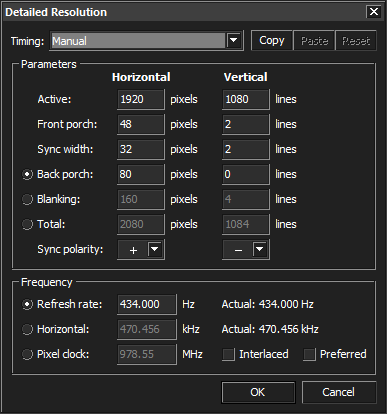 (05-17-2021 11:33 AM)ToastyX Wrote:(05-17-2021 04:41 AM)Nimmy Wrote: 2. On new block(display 1.3), I created new detailed resolutions at 360hz 1080p(native) and 1680x1050 360hz and i tried using automatic(PC), Exact, Exact Reduced. Then Press ok/restart driver#2 says you added the resolutions, so what's #3 for? Okay, I didn't realize that adding a resolution into the extension block meant that it would show up in the control panels. I assumed I had to redo it because it didn't show up in the Detailed Resolutions sections after I had added it. Knowing that I tested multiple resolutions on 360hz using Automatic(PC), Exact, Exact Reduced, and a couple of others that I didn't really expect to work. The main two ones I tested were 1680x1050 and 1728x1080 when the former didn't work. That being said, every single test resulted in failure with the monitor just showing that it was going into sleep mode. I saw somewhere that G-SYnc monitors usually can't preform out of some set of presets, so I guess i'd have to find a resolution thats already in one of those? Note: Found some dude on the Latency and gaming discord who got this monitor overclocked to 434hz with these settings. Don't know if this is useful information or not but just wanted to point that out. |