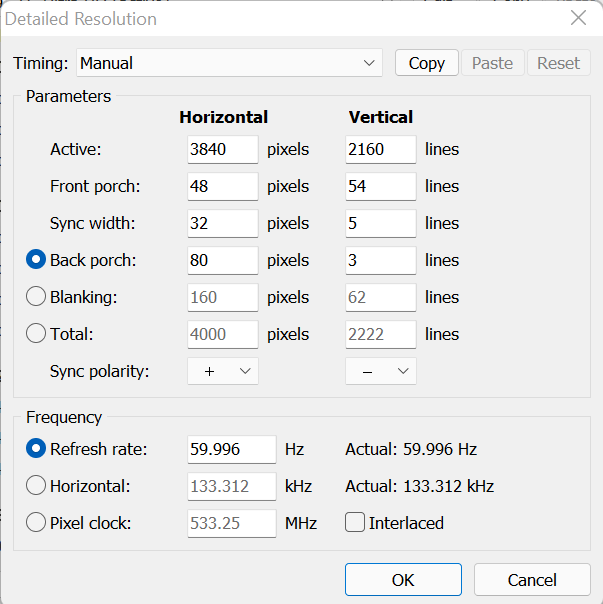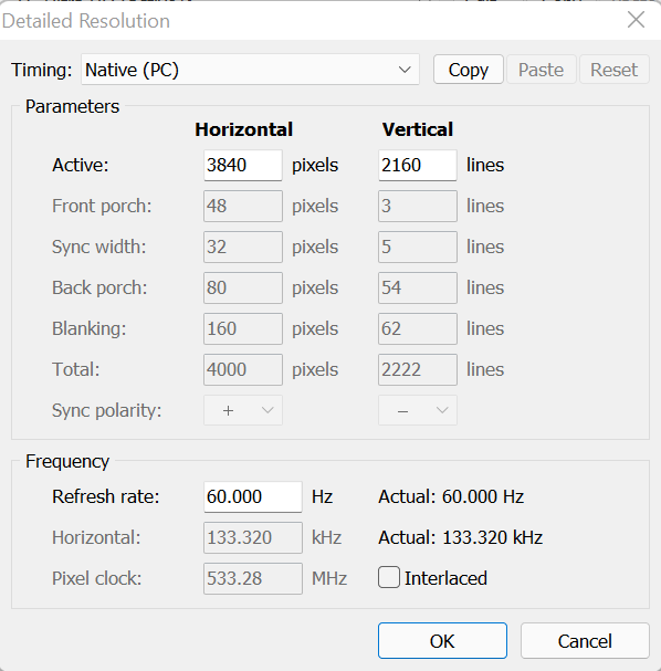 (03-27-2022 04:28 PM)filmgeek47 Wrote: MadVR will show me the deviation off the current clock. Can I use that to figure out the right timing? I’m also a bit confused by what I’m getting off the calculator. When I input 4k resolution at my frame rate, none of the pixel clock results are for 3840x2160.The results show the required totals including blanking as shown in CRU. |