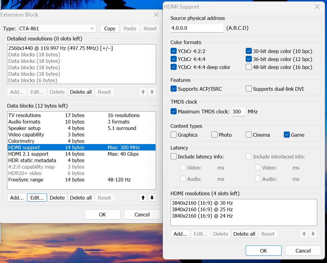 (11-04-2023 09:12 AM)opa99 Wrote: I have tried different settings on the tv, and on the extension blocks. What I currently have and what gets me "closest" to the end is attached as the CRU settings, and the windows settings. This leads Windows seeing the channels, and trying to output sound (animation is there), but AVR only receives 2.0 audio.Does this happen at 3840x2160 or only the custom resolutions? |