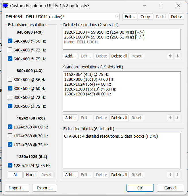 (07-04-2024 06:07 PM)nikif002 Wrote: I am having an issue where custom resolutions stopped "taking" for me. I am on Windows 11, Dell XPS 9510 laptop. Hooked up to a Dell U3011 through HDMI and a Dell USB-C multiport adapter.Ideally you should use DisplayPort to avoid having to add 2560x1600 manually because the monitor doesn't officially support 2560x1600 with HDMI even though it will work if you can add it. The * means it is saved. It would say "(restart required)" if it wasn't taking effect. The GPU is definitely capable, so the driver is ignoring the resolution for some reason. I don't know if Intel listens to this, but check the maximum TMDS clock in the HDMI data block in the CTA-861 extension block. It should be high enough to accommodate the pixel clock for the resolution you want. I recommend just putting 340 MHz because that's the standard maximum for HDMI 1.4. |