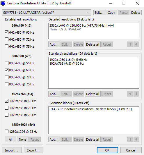 Hello! I've got a PC CRT monitor that I have hooked up to an Nvidia GPU through a Tendak HDMI to VGA adapter on Windows 11. The adapter works fine, and I've defined a custom resolution in the Nvidia Control Panel before successfully, but now I'm trying to get 640x480 to work. As it didn't show up in the resolution picker, I first tried defining it in the Nvidia Control Panel, and it tested successfully, but then when switching to the resolution later it would be a different timing that would be too narrow and beyond the ability to widen on the CRT. I then discovered CRU and decided to try and define the resolution there, but regardless of what I do in CRU it doesn't seem to be defining any new resolutions or changing anything in the Nvidia Control Panel resolution picker. For that matter, the custom resolution that I previously definied in the Nvidia Control Panel isn't showing up in CRU either. I've tried rebooting multiple times and using the restart64.exe utility, but nothing is changing. Is there something I'm missing here? I would love to define a 640x480 mode using custom timing and have it stick. Thank you!