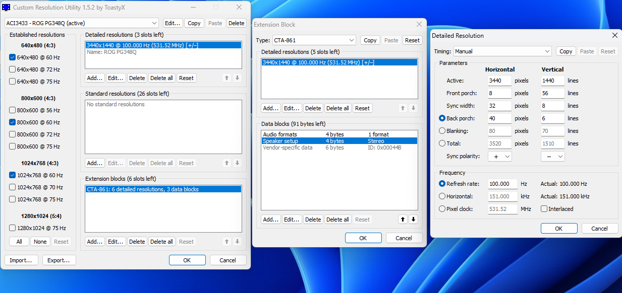 (03-11-2025 08:32 PM)ToastyX Wrote:(03-11-2025 08:28 PM)Arnaldo Wrote: I've successfully patched my Radeon 4250 driver, now trying to set a new resolution using CRU tool.Your GPU is way too old. HDMI 1.0-1.2 only supported up to 165 MHz pixel clock, and the patcher does not support 4000-series GPUs. Heyo Toasty, I was wondering if i could get your help with configuring cru with my monitor. PG348Q old school. I have always had issues with the extension block causing games to not read the supported resolution list ingame. Adding in or even leaving in the stock resolutions in the extension block override ingame. A good example is metro last light. Im not too sure why its listed like that but it breaks some games reading resolution and then more games reading the hz. Since the default detailed resolution is 60hz. This is an overclockable monitor. 60-100hz. I can change the main one to the 100 hz and swap over the settings. Then I delete everything except for the 100hz in the extension block and it seems to keep gsync enabled and the 100 hz. This way the games detect 100hz immidiately and dont override res list. Is this the proper way to do this or no? |