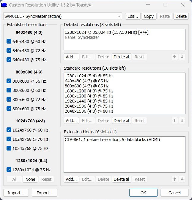(03-13-2025 02:28 PM)ToastyX Wrote:(03-13-2025 06:57 AM)Ezzelin Wrote: Yes, it wasn't anywhere in the all modes dialog list. I went ahead and added it through the Nvidia Control Panel again, and now it shows up in the all modes dialog, but it still isn't respecting the timings that I gave it. So my main issue is that I don't seem to be able to change the timings, and I was hoping CRU would help me do that.Something isn't right. Show me what you have in CRU. Here's a screenshot of what I'm seeing in CRU. Unfortunately, even if I define 640x480 in Nvidia CP, it doesn't survive a reboot. |