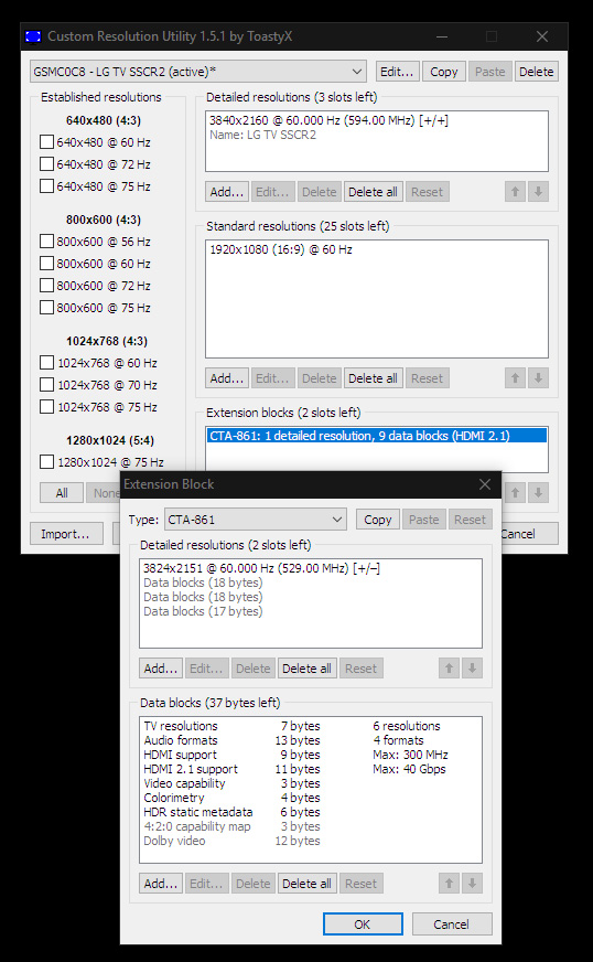 (04-12-2025 09:25 PM)ToastyX Wrote:(04-12-2025 09:07 PM)ildottore101 Wrote: Ok, i edited displayid 1.3 and got blackscreen again. On cta-861 i cant enable it becaus pixelclock turns red.That is supposed to work if the monitor supports the timing. Do you have any other monitors connected? No other Monitors connected. I was able to use these settings in nvidia driver custom resolution successfully but only without DSR. With DSR on, the customres setting in nvidia driver is greyed out/disabled. |