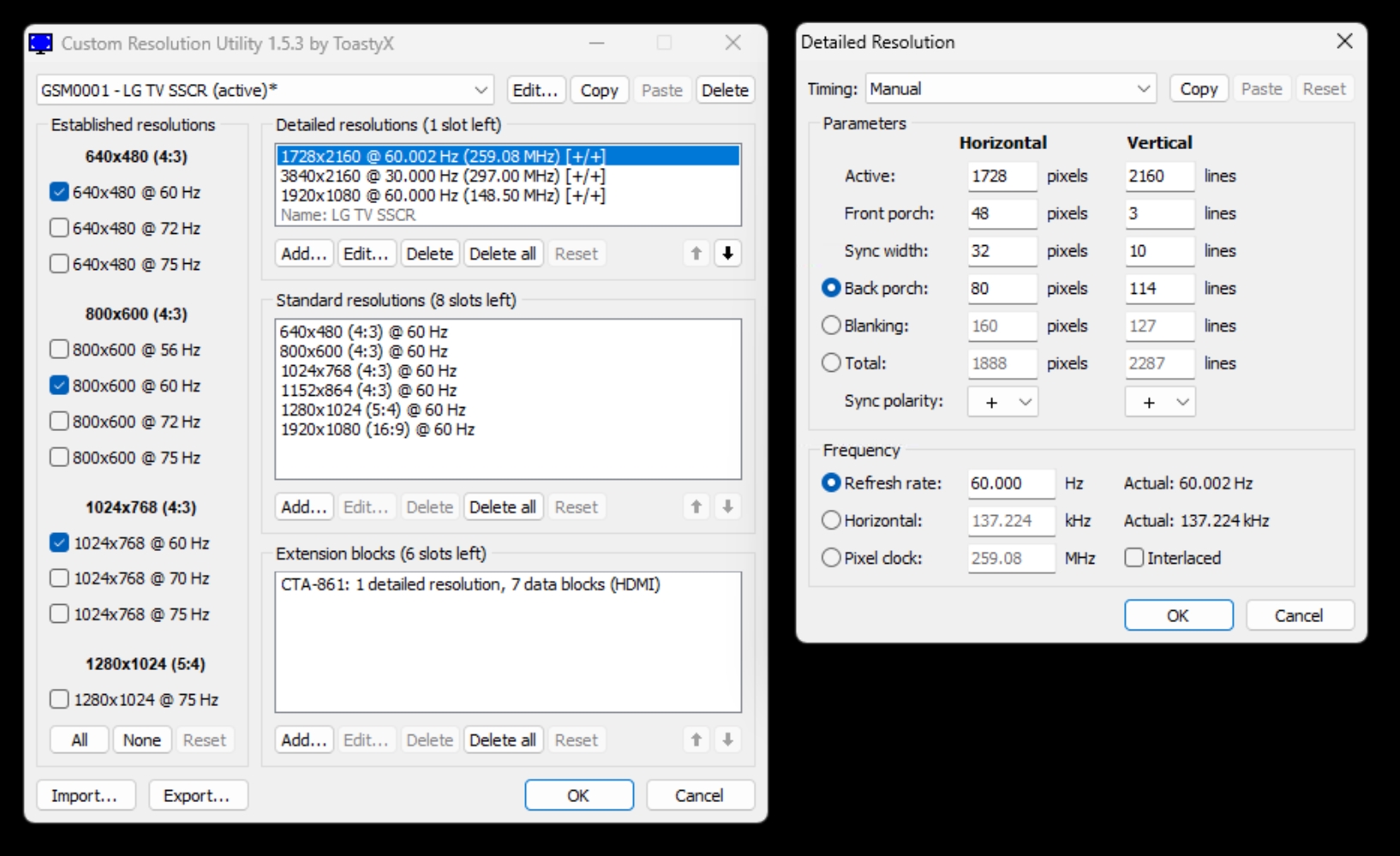 I'm using it to do something a little bit special: Because it was almost impossible to find a big LCD screen in 4:3 (or 5:4) ratio for my arcade cab, I've decided to put a 4K TV monitor in it (verticaly), and to use only the center with a custom resolution ! To be clear, I've done it like this: And of course, the black part are not visibles, they are behind the control panel and the marquee. Here is my setup in CRU: I'm using a windows 11 PC, with a RTX 3060 and everything works fine. I use retroarch to emulate most of my arcade game, and when you set it up at the rigth resolution and add a few scanline, the result is incredible, this is almost a CRT screen ! But now the problem: for the SEGA Model 2 games, I use the M2emulator program. And everytime I switch the games to full screen, my TV goes black and go "no signal" I've setup the emulator to use my custom resolution of 2160x1728 when in full screen, but there must be a problem with the refresh rate or something. (I know the game is running fine, because if I look with my main computer via VNC I can see the game running in full screen) Have you got any idea of what I'm doing wrong ? |