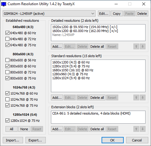I've just upgraded my PC from Win 7 with old Gigabyte MoBo Intel Core quad and GPU nVidia Quadro 1500 to a new Win 10 x64 setup Intel i7, Asus ROG Stix Z390, RTX 2070 Super. I have a dual 24" monitor configuration (LG 24MB67 connected to DP + LG L245WP connected to HDMI) Both are configured in Window to display at 1920x1200 @ 59.950Hz The first monitor looks great! The second one, not too much... ![]() The desktop is stretched horizontally a bit and the entire desktop is shifted to the left for about 120 pixels and to the top for about 20-30 pixels. I tried to connect it to a different PC with a different HDMI cable but i got the same exact result. So the problem it is not related to GPU or cable i think. I heard about EDID information 2 days ago and i have understood the problem could be about corrupted info sent to GPU card from monitor. So i launched CRU but I'm a totally newbie at it. ![]() ![]() Is there an official manual for it? I really would like to know more about the gui sections and how them work. Anyway, having you here ToastyX, i kindly ask you to help me to fix the problem. I have attached 4 images about CRU (2 x monitor). I noticed the good displaying monitor has the native configuration 1920x1200 in the extension block, while the bad one not. Thanks a lot. Daniele |