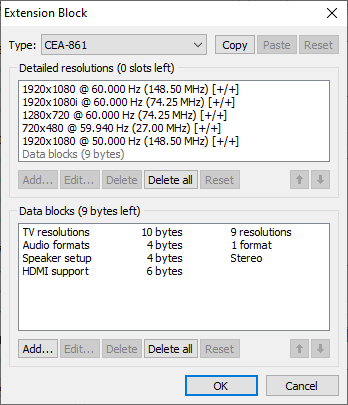 (06-23-2020 07:41 AM)cyrb Wrote: The GPU is NVIDIA GeForce 840M (laptop GPU). The Windows 7 machine is NVIDIA GTX 1050 TiYou didn't say these were two separate computers. This is not a Windows 10 issue. You said the Windows 10 computer showed no extension blocks, but your screenshot shows a default extension block. That just means CRU can't read the extension block with your laptop. Copying the settings over from the other computer should have worked unless the driver doesn't support EDID overrides. Try deleting the extension block. |