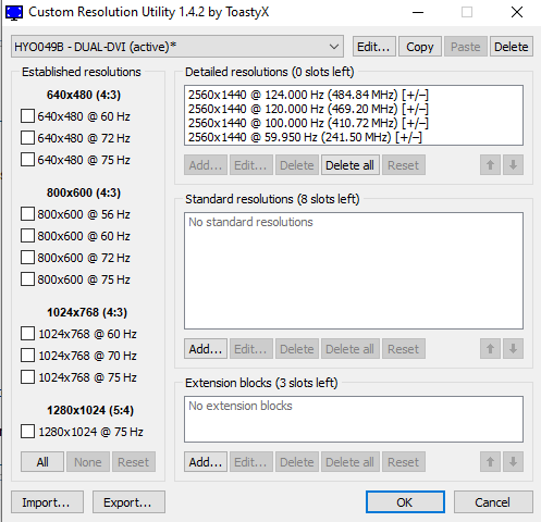 (06-26-2020 12:45 PM)ToastyX Wrote:(06-26-2020 11:12 AM)AlphaRadke Wrote: CRU is not working anymore after last NVIDIA update. Now I have to use the nvidia's custom resolution which doesn't work in games for meWhat exactly are you doing? Creating custom resolutions with overclocked refresh rates on my zowie.. did they patch edid ? lol |