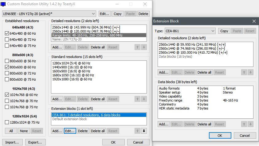 (07-18-2020 02:43 PM)ToastyX Wrote: I see 3840x2160 @ 50/60 Hz in the TV resolutions data block in the first extension block. It might also be in the second extension block, which is likely a DisplayID extension block, but it seems CRU can't read it. You should be able to just delete the second extension block. Thank you for your reply. I have already tried deleting the whole set of TV resolutions and the HDMI support block (and restarted the driver/rebooted the machine), but Nvidia's driver still sees those phantom resolutions. By second extension block, do you mean the "Default extension block" in the following screenshot? Edit: Removing the extra "Default extension block" did the trick and removed all the extra resolutions and allowed DSR to correctly scale from the native 2k resolution with the correct refresh rates, rather than the phantom 4k resolution at 60 Hz. However, there is a downside: removing that extension block also removes the 165 Hz resolution. I believe that must be the block Lenovo added to overclock the panel to 165 Hz. I might be able to bring 2k 165 Hz back using this guide (which is actually supposed to fix another problem with my monitor), though: https://motherbear.home.blog/2019/12/10/...creen-fix/ Is it possible to add support for reading that block using CRU in the future? |