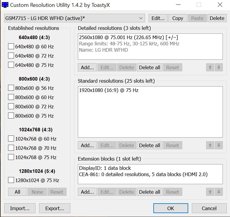 I own an LG 29WK600 (29" UWD 2560x1080 75Hz "HDR"), and am currently using it with an RTX2080S through DisplayPort (1.2 I believe, GPU-Z shows 5,4Gbps). Some time ago I was experimenting with nVidia custom resolution, typed in 3440x1440 just for the kicks and for my surprise it "worked", I mean, the image came right up, stuff on the screen were smaller, and no glitches that I could see. Typed in 3840x1600, and it also worked, same way described before, both at 75Hz. For some reason the image became a lot darker when using custom resolutions through nvidia panel, but at least I knew it might be possible. After that, I decided to try CRU and see if I could create new resolutions properly, and I could, this time I went only for 3840x1600 75Hz, everything worked fine, the OSD from the monitor itself showed that resolution. However, from time to time the screen goes black for like 1 second, and than comes back. Happens at 3440x1440 75Hz as well, everything seems to work beautifully, and then out of the blue screen flashes black and comes back. Naturally I tried lowering refresh rate, and both resolutions work flawlessly at 60Hz, no flashes at all, but since the monitor is rated 75Hz, I was hoping to actually be able to use those resolutions at the "desired" refresh rate. What I would like to know, please, is if there is any possibility that the "flashing behavior" is something that can be solved by messing around with the settings on CRU? Or it sure means that the monitor simply cannot handle 75Hz at those resolutions? I'll attach a few images from my current settings, I've been messing around with timings for a while now, with no luck, but the weird thing for me is that the flashing has no pattern at all, sometimes it occurs watching videos, sometimes does not, sometimes I can play a game for almost an hour without any issue, sometimes it's just impossible. I lowered the FreeSync range from 40-75 to 48-75, to see if it could help, but no deal. Also, since I could not find something specific about my case when searching for clues, I've added HDMI and HDMI 2.0 blocks, but I have no idea if it makes any difference or not in this scenario. Thank you in advance. |