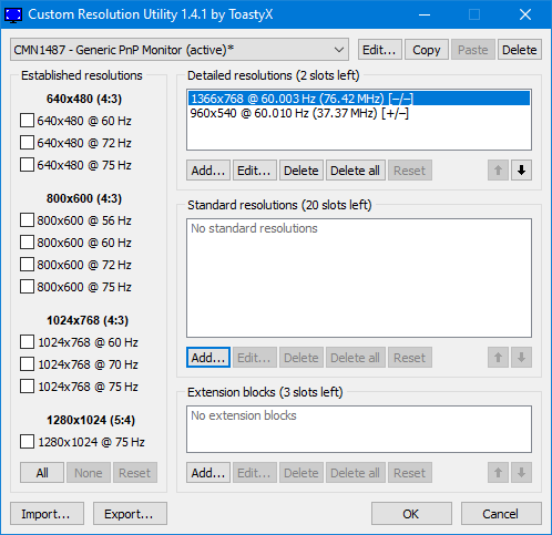 I'm currently facing an issue here. CRU is able to create a custom (lower than native) resolution on a new driver version but not on old. I'm using a Lenovo laptop, it's the IdeaPad G40-45 (quite the old one) with the eGPU variant (I'm using the AMD one). I first tried CRU on the current latest available driver (as of writing this reply), which is version "AMD Radeon Adrenalin 2020 Edition 20.9.1" and my custom resolution is there! nice! but my biggest problem with the latest driver is that the performance is extremely poor. I'm curerntly playing this game called NieR: Automata and on my display's native resolution with the new vs old driver, the performance is so much better on the old driver (issued by Lenovo) the old driver version is "AMD Radeon Crimson ReLive 17.1.1" BUT! there's also another problem with the old drivver... which is, any custom resolution created by CRU won't show up anyhwere. To make sure, I even tried a bunch of titles and no custom resolution is there. I don't want to go back using the new driver but I also really really need the custom resolution... I did exactly the same process on creating the custom resolution as I did on the new driver but with the old driver, the custom resolution is not showing anywere. I really hope I could get an answer in here. for the record, I used to have a custom resolution setting built into the AMD Settings itself, back on 2017-ish. but now, that option is gone. so, there's no way to create a custom resolution other than using CRU (even through the AMD Additional Settings / Catalyst Control Center). --- system summary --- Lenovo G40-45 AMD A8-6410 APU Radeon R5 M230 2GB Windows 10 Professional 2004 x64 (fully updated, auto-update always on) CRU works on driver: AMD Radeon Adrenalin 2020 Edition (20.9.1) and AMD Radeon Adrenalin 2020 Edition (20.4.2 WHQL) CRU not working on driver: AMD Radeon Crimson ReLive 17.1.1 what I really need: custom resolution (lower than display's native resolution) on old driver "AMD Radeon Crimson ReLive 17.1.1" CRU version: 1.4.1 (EDIT: updated to 1.4.2 but still the same) |