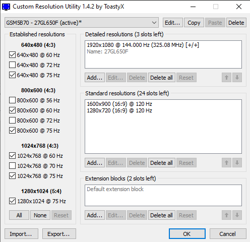 thanks for creating this tool. I have a question: Can this tool break TV's? I'm asking because I got a new Hisense U8B TV and when I was plugging it into my PC I couldn't find any settings for 120hz. The resolution I was going for was 1440p @ 120hz through HDMI 2.0 . Should work, shouldn't it? Well , at least I got a stable signal. I used the middle value between 1080p and 4k and changed 60hz for 120hz , and the Output was showing 120.00 hz too. Can you just change the Hz without editing the other values? So I was playing some THPS1+2 in HDR (RGB mode) , some RDR2 and couple other games and it ran smooth and I couldn't be happier. But now a few days ago the backlight of the TV seems to have broken and I'm not sure if its because of this tool, wrong values or god knows. It got so bad that the TV isn't usable anymore as the backlight doesnt start. Even when the HDMI isn't plugged in anymore. Thing is, if I point a flashlight to the tv I can still see picture, it's just not lit. If I had to guess this tool shouldn't make a difference to the LED array backlightning should it? As I mentioned, WHEN the picture was there I couldn't see any issues at all. But the device seems to have an issue turning on the LED Array. Luckily I can return the device so thats what I'll do. Have I been just shit out of luck or could I have missused this tool which caused the LED Array to fail? I'll attach the screens with the values (1440p is the custom one) maybe you can see something. Because if I get the same TV Model again from the seller, I don't want to run into the same mistake again. Would it help to put it down a notch, to 100hz ? Man I'm stressed because of this x) thanks for reading regards |