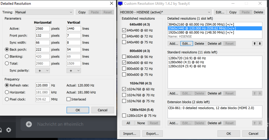 thanks for creating this tool. I have a question: Can this tool break TV's? I'm asking because I got a new Hisense U8B TV and when I was plugging it into my PC I couldn't find any settings for 120hz. The resolution I was going for was 1440p @ 120hz through HDMI 2.0 . Should work, shouldn't it? Well , at least I got a stable signal. I used the middle value between 1080p and 4k and changed 60hz for 120hz , and the Output was showing 120.00 hz too. Can you just change the Hz without editing the other values? So I was playing some THPS1+2 in HDR (RGB mode) , some RDR2 and couple other games and it ran smooth and I couldn't be happier. But now a few days ago the backlight of the TV seems to have broken and I'm not sure if its because of this tool, wrong values or god knows. It got so bad that the TV isn't usable anymore as the backlight doesnt start. Even when the HDMI isn't plugged in anymore. Thing is, if I point a flashlight to the tv I can still see picture, it's just not lit. If I had to guess this tool shouldn't make a difference to the LED array backlightning should it? As I mentioned, WHEN the picture was there I couldn't see any issues at all. But the device seems to have an issue turning on the LED Array. Luckily I can return the device so thats what I'll do. Have I been just shit out of luck or could I have missused this tool which caused the LED Array to fail? I'll attach the screens with the values (1440p is the custom one) maybe you can see something. Because if I get the same TV Model again from the seller, I don't want to run into the same mistake again. Would it help to put it down a notch, to 100hz ? Man I'm stressed because of this x) thanks for reading regards |
