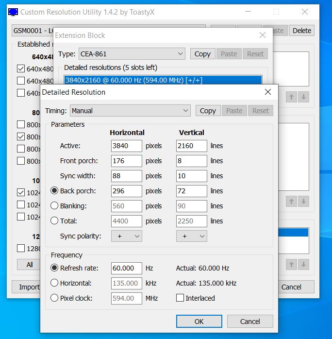(10-23-2020 11:53 PM)ToastyX Wrote:(10-23-2020 07:15 PM)slobo2712 Wrote: Ok I did what you said,and im missing something because I have lose all 4k resolutions,only 1080p left to choice in windows.Also I can add 4k res by hdmi support at picture 4 but only 30hz..Try changing the first detailed resolution to 30 Hz. If 60 Hz still isn't available, then the driver doesn't support YCbCr 4:2:0. Thank you for answer,seems that drivers doesnt support 420 at 60hz but 30hz does as you can see on picture 3,Im not able to add 3840x2160 60hz no matter what..Just dont know why 2k60p can be added by same way.Confused... |
