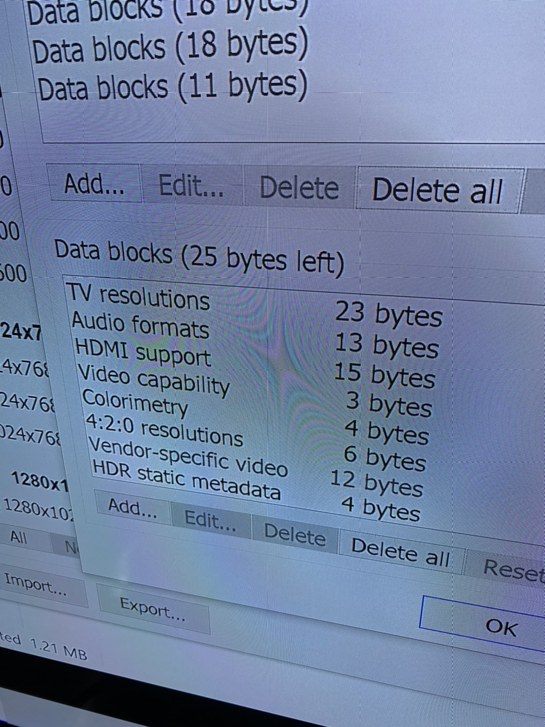 (12-15-2020 06:59 AM)ship1666 Wrote: I follow your steps and what happen is I get the collect resolution to choose in NV surround after boot up. However, after I click apply, only one TV has signal and others two still has no signal.Something is wrong then. What kind of adapters are you using? You might need active adapters for Surround to work with three monitors. (12-15-2020 06:59 AM)ship1666 Wrote: PS. 5. Delete any 4:2:0 resolutions and capability map data blocks if they existYou don't need to delete the video capability data block. Only 4:2:0 resolutions and 4:2:0 capability map if it exists. |