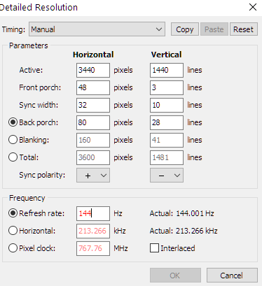 (12-30-2020 05:19 AM)Skok Wrote: Hey there, so I'm having an issue setting a custom refresh rate with my native resolution. I have a 3440x1440 144Hz monitor that I wish to cap at 143Hz. It's an obscure issue but the TLDR is that my monitor occasionally skips every other frame down to 72hz at 144hz when the input is changed but does not have the same behavior at 145hz or 143hz. The issue is I can't set 10-bit color in the Nvidia control panel with a non-native refresh rate. Obviously, CRU fixes this issue but nonetheless, it will not accept any refresh rate above 122hz. I've attached a screenshot showing the issue with setting it to 144hz at 3440x1440 which is the monitor's native resolution and refresh rate. If anyone has any ideas it would be greatly appreciated. Thanks!Please read the first post. |