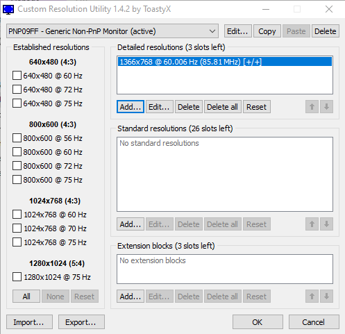 (01-07-2021 03:20 PM)ToastyX Wrote:(01-07-2021 02:49 PM)choichoi10 Wrote: the firsts screenshot is wrong mybad, my monitor has always been detected as generic non pnp even with other vga cables and the resolutions are there already when i used Cru, what should i put in the extension block? really need help because idk how this worksYou don't need an extension block. You only need one detailed resolution for 1366x768 @ 60 Hz and nothing else. I tried this and gave me bsod "system thread exception not handled"