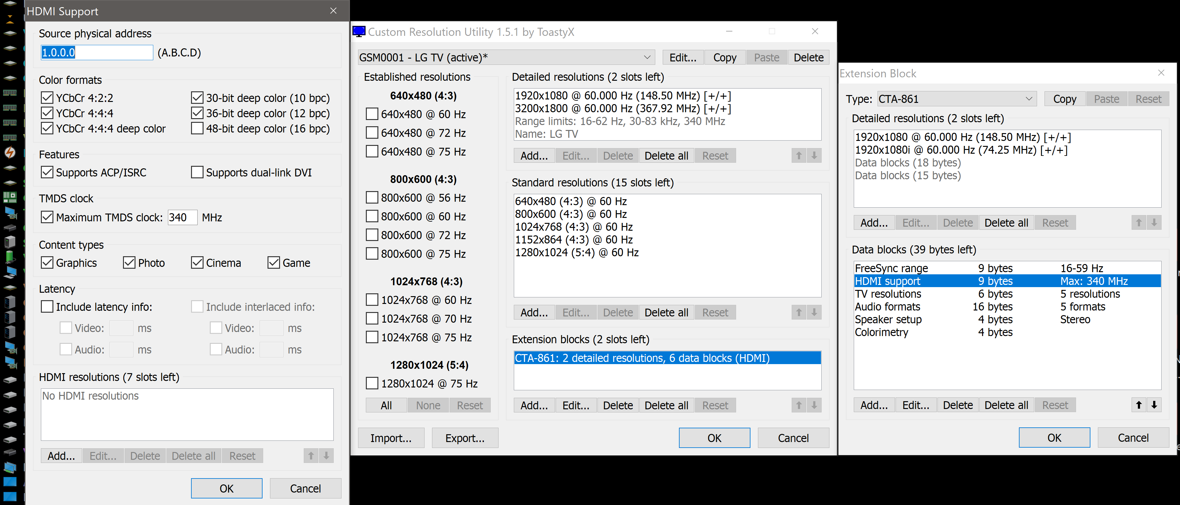 Thank you very much for your free software. You gave a new life to my LG 32 TV from 2013, thank you. I find your CRU program wonderful. I have read a lot but one thing is not clear to me, I have an RX580 with HDMI 2.0 output, the HDMI cable is 2.1 and the TV is HDMI 1.4B. The question is if I leave the TDMS at 340 if what commands is the limitation of the HDMI1.4B of the TV, or sends the HDMI 2.0 of the RX. It lets me add the HDMI 2.x block and it doesn't give me a problem, but if I limit the 1.4b to 340, doesn't it make sense to set the TDMS to 600? Thank you very much and greetings. |