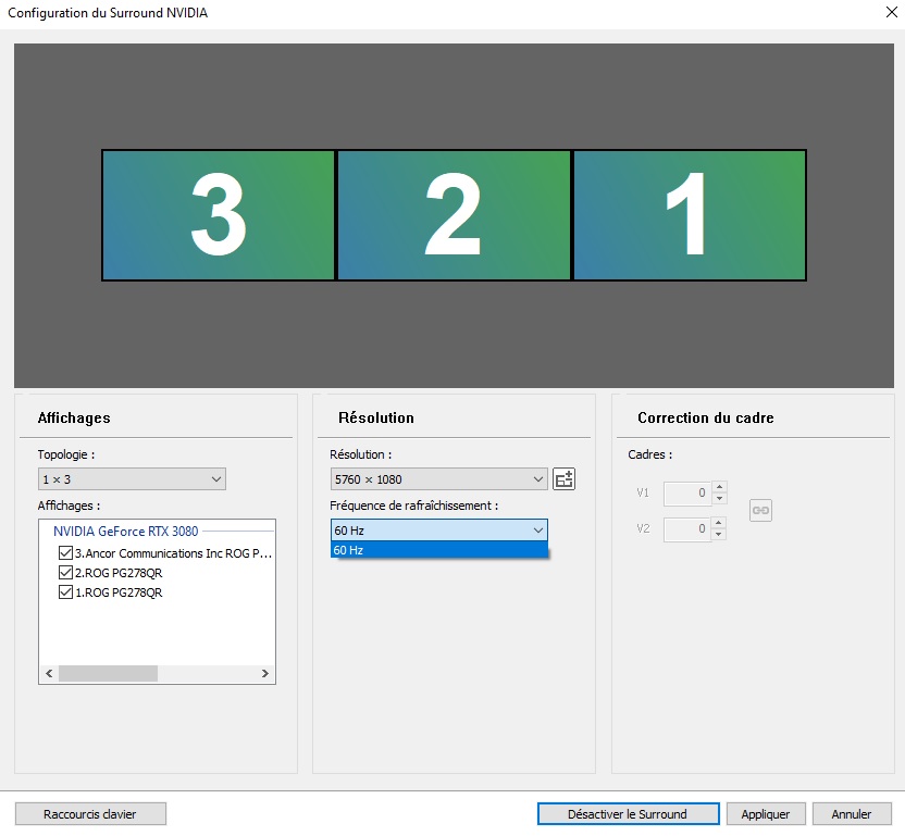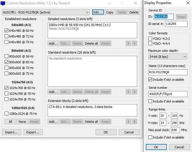 I use 3 monitors, 1 PG278Q (2560x1440 144hz), 1 PG278QR (2560x1440 165hz OC), 1 PG278QR (2560x1440 165hz OC).* I use 3 displayports. With Nvidia surround I can only have 7680x1440@ 120hz and 5760x1080@60hz. Is it possible to use CRU to play at 7680x1440@144hz and 5760x1080@144zh ? NVIDIA SURROUND CRU detail for PG278Q CRU detail for PG278QR (both same) |