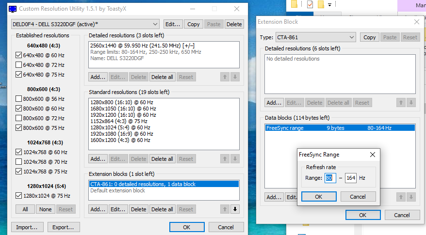 (08-17-2021 03:10 PM)ToastyX Wrote:Please see pics attached. Tried both setups separate and together, and on each of the 3 entries for my monitor (only one listed as active).(08-15-2021 04:31 PM)MasterofSalt Wrote: Hello, 6900 XT with a Dell s3220dgf freesync flickering issue. One of the fixes is to set the freesync range to 80-164 from 48-164. However it does not appear to be working. Range remains 48+, connected via DP port, and set V range via both "detailed resolution" (which weirdly shows the current refresh rate at 59.950, even with the monitor and drivers both telling me its at 164 Hz) and via the Extension Blocks. Any ideas?I don't understand what you're saying. The lower end of the FreeSync range isn't set with a detailed resolution, and CRU doesn't show the current refresh rate. The FreeSync range for DisplayPort is set using the range limits (use the "Edit..." button at the top). I didn't think the detailed resolution showed the active setup, but wanted to let you know just in case. |