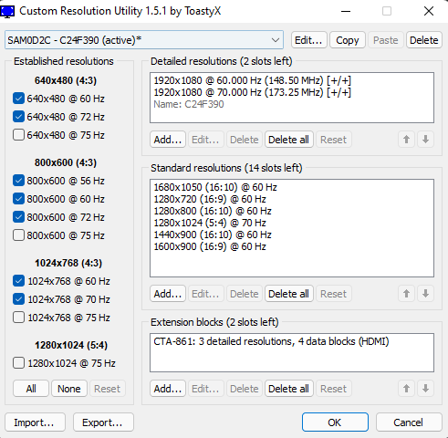 (08-25-2021 02:18 PM)Adenis Wrote: Hi there, new to CRU but I managed to overclock my monitor up to 70hz, i have a problem though, i play CSGO and sometimes I like to use 1280x960 stretched but it's 60hz and on CRU at established resolutions I only see 1024x768 (60, 70, 75hz) and 1280x1024 (only 75hz) but i don't see 1280x960, do i have to add it manually on detailed resolutions and overclock it to 70hz or is it not available at all?Established resolutions are basic modes predefined by the EDID standard. You can add any resolution you want as a detailed resolution. Common lower resolutions like 1280x960 are also possible as standard resolutions. |