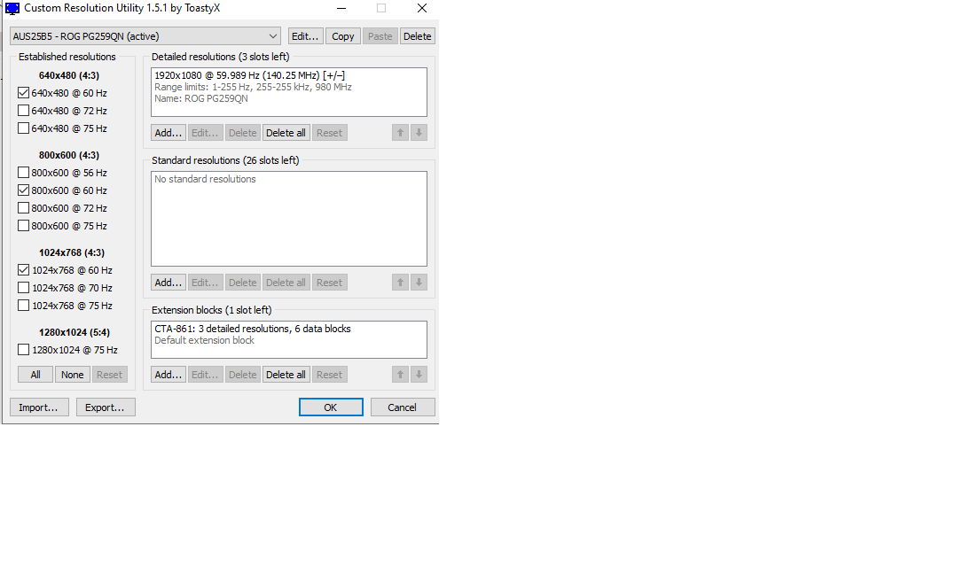 (08-25-2021 11:25 PM)Nintendo Maniac 64 Wrote:Thank you!(08-25-2021 02:18 PM)Adenis Wrote: i play CSGO and sometimes I like to use 1280x960 stretched but it's 60hz and on CRU at established resolutions I only see 1024x768 (60, 70, 75hz) and 1280x1024 (only 75hz) but i don't see 1280x960, do i have to add it manually on detailed resolutions and overclock it to 70hz or is it not available at all? (08-26-2021 02:39 AM)ToastyX Wrote:(08-25-2021 02:18 PM)Adenis Wrote: Hi there, new to CRU but I managed to overclock my monitor up to 70hz, i have a problem though, i play CSGO and sometimes I like to use 1280x960 stretched but it's 60hz and on CRU at established resolutions I only see 1024x768 (60, 70, 75hz) and 1280x1024 (only 75hz) but i don't see 1280x960, do i have to add it manually on detailed resolutions and overclock it to 70hz or is it not available at all?Established resolutions are basic modes predefined by the EDID standard. You can add any resolution you want as a detailed resolution. Common lower resolutions like 1280x960 are also possible as standard resolutions. Thank you! |