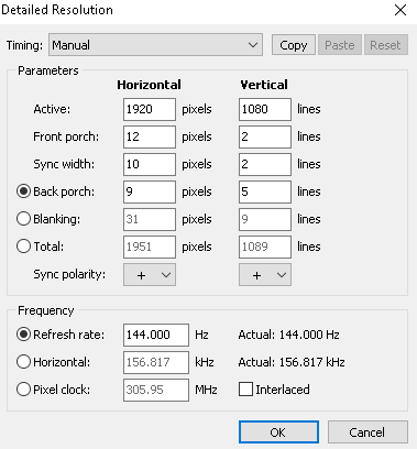 I'm trying to extend the low end of the FreeSync Range of an AOC C24G1 over DisplayPort. If I set it as you suggest on the guide ("Edit..." at the top, then changing "V rate" and checking "Include if slot available", and then running restart.exe) nothing changes and Radeon Software reports the stock FreeSync range. However, if i use the HDMI method (even though I'm using a DisplayPort cable) then Radeon Software does report whatever range I set in CRU, but when I boot a game, I get random black screens. What I'm doing wrong? Thank you. |