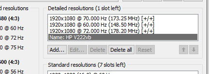 (11-17-2021 02:49 AM)ToastyX Wrote:(11-17-2021 01:59 AM)windy401 Wrote: I tried using this on my new monitor (HP V222vb) and it seemed to work fine going from 60->70hz. However now I notice that windows now calls the monitor "wired display" instead of "HP V222vb" even after restarting and putting everything back to original settings. I'm concerned I may have screwed something up, has anyone seen this happen before, should I be worried?Windows should show whatever name is shown in CRU, but you have to make sure the name is showing in the detailed resolutions list. If you add resolutions and it pushes the name off the list, then Windows won't show a name. Nothing you do in CRU should be permanent since it doesn't modify the monitor. Hmmm. Looks like the name in there is fine. "Nothing you do in CRU should be permanent since it doesn't modify the monitor." Figured as much, but the reassurance is nice, lol. |