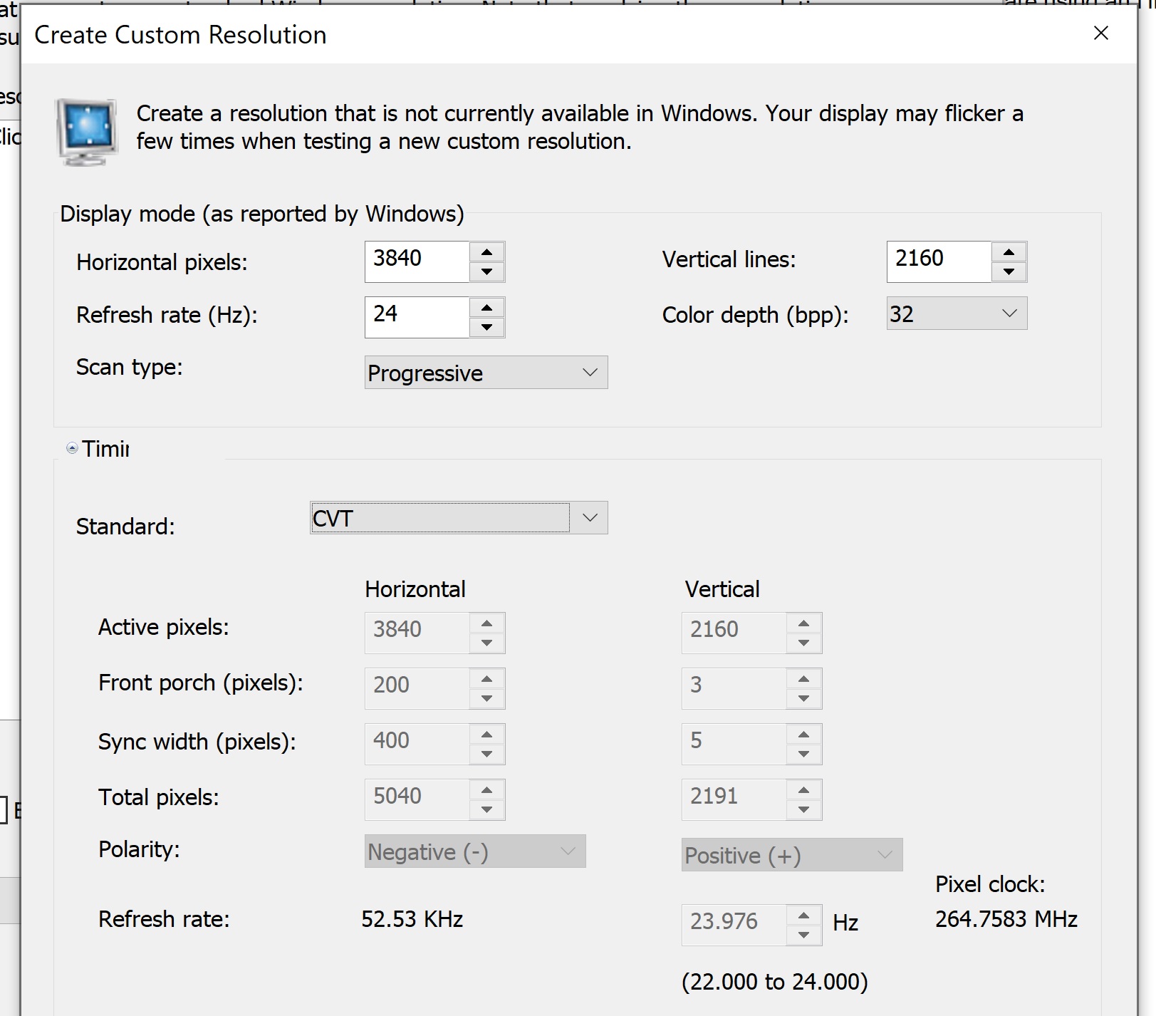 I don't mind using CRU or even the Nvidia custom resolution tool, but I have a serious problem: I Don't know what the heck any of the values mean aside from resolution and refresh rate. Porches, blanking etc etc.... Especially with the CRU tool, I have literally no idea what I am doing. The Nvidia default for 23.976 is pretty close - 1 dropped frame every 50 or so minutes. Which I can live with if there is not an easy way to test some other custom res. I tried using the pixel clock calculator, but don't know what to do with the values that I got. (https://www.monitortests.com/pixelclock....rtvlines=1) My setup: HTPC (Nvidia 3080 driver version 456.71), Denon X3400H receiver, Sony 285ES 4k Projector. UPDATE: I tried adding a detailed resolution with CRU. It added the resolution under the PC section of the Nvidia resolutions. When I select it, and apply, it blanks for a second, saying it is applied, but then just shows the resolution selected as the one up under HD, SD, 1080p section of the Nvidia drivers. I don't mind using the Nvidia custom resolution tool, but need to know how to convert the information the web page is telling me. |