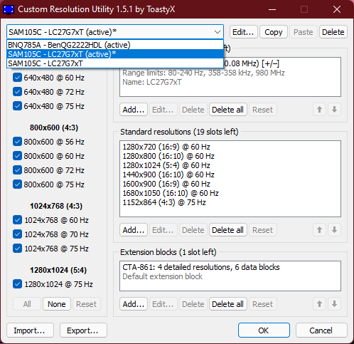 I am trying to change the Freesync range of my monitor(Odyssey G7). Both entries related to that in cru are 80-240(detailed res, extension blocks) but the actual range is 64-240 when tested in nvidia pendulum. Any changes I make have no effect at all. CRU detects 2 samsung monitors but i make all the changes to the active one. Should I do it on both? |