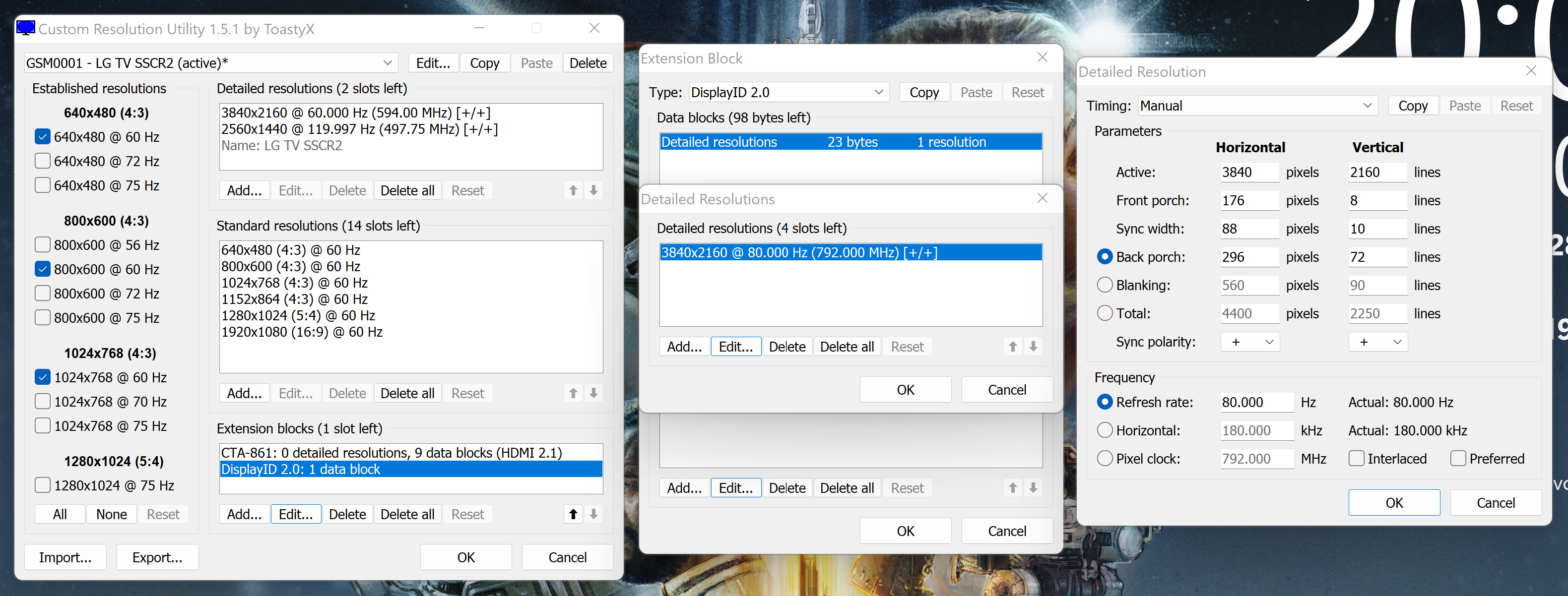 Hello, thanks for your software. I have a TV 4K/120 Hz. I need to make a custom resolution like 3200x1800/80Hz. I used to just create it in the Nvidia control panel, or enable their scaling feature to add intermediate resolutions. But now, when such resolutions are enabled, the color signal becomes 4:2:2. In native 3840x2160 120Hz produces true 4:4:4. It started with all the latest nvidia drivers. Using your Scaled Resolution Editor (SRE) utility, I created a custom resolution of 3200x1800 and it works with 4:4:4 chroma, but you can only select standard 60/100/120 Hz refresh rates, and I need 80Hz. Through CRU, I added a resolution with the parameters from the screenshot via DisplayID 2.0, but it still goes into color 4.2.2. How to be? Can it be possible to replace the standard 100Hz refresh rate with 80Hz? Screen |