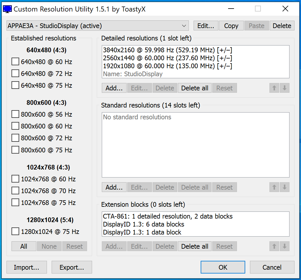 (08-16-2022 03:31 AM)kaleb418 Wrote:  Hello, I'm trying to use this utility to create a new resolution profile for my apple studio display, which for some reason only offers its native 5k configuration on windows 10. I added a new resolution to the detailed resolutions list and restarted using the .exe, but the new resolution wouldn't show up in the OS settings after this. Any idea why? Thanks so much!