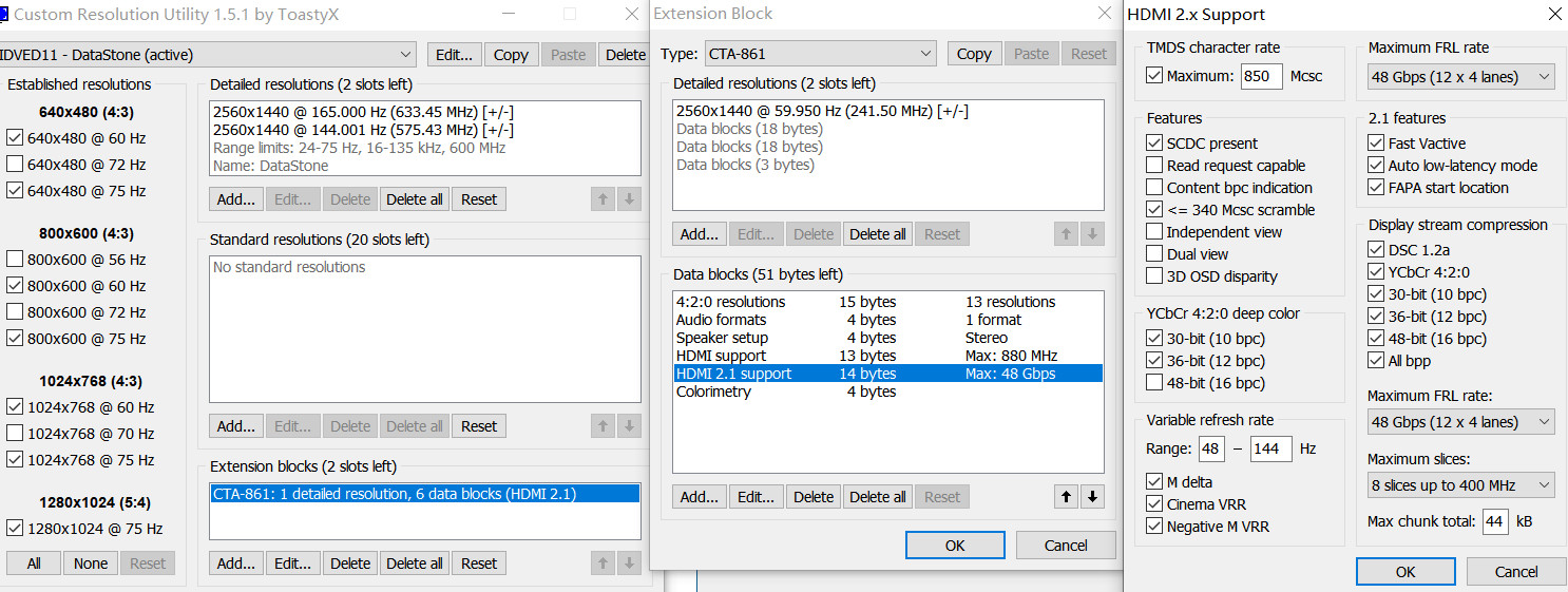 (10-06-2022 02:21 PM)ToastyX Wrote:(10-05-2022 09:08 AM)simon52min Wrote: What i 'd like to do is connect a virtual display device through the hdmi interface of the 3070 graphics card, to create a virtual desktop of 2560 * 1440 @ 165Hz, or 3440 * 1441 @ 144HzYou need HDMI 2.1 with FRL for those resolutions. All the emulators I know only do HDMI 2.0. Can you tell me in detail what is the difference between the HDMI 2.1 and the HDMI2.0 emulator? I had added CTA-861 block via cru tool, and add data block hdmi2.1 support. Is there a parameter that is not set correctly? |