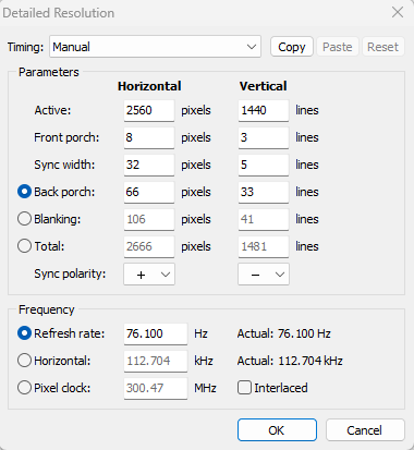 Monitor: AOC Q3279VWFD8 GPU: Sapphire Nitro+ RX 480 8GD5 (UEFI) SKU number: 11260-07 Connection: DisplayPort cable that came with monitor, using 10bit color depth. Windows 11 22H2 , Latest AMD driver (atm 22.11.2) [I have created the custom resolution in CRU and not in AMD driver settings, idk if its correct?] CRU settings: Look in screenshots Stock @75hz (which does not seem to follow the VESA standard) My over/under-clocked @76hz, changed freesync also from 48-75 to 38-76 My target is to get the "correct/best" settings for my monitor to achieve "LFC" (which requires the maximum freesync range to be at least x2 of the minimum freesync range). I have it already working except a weird "tear/stuttering" that happens at ~@38fps probably because it is just about double and not even 1hz more as I get blank screen above 76.1/76.2 Hz. But I am not sure if the monitor timings are correct and maybe hurting something