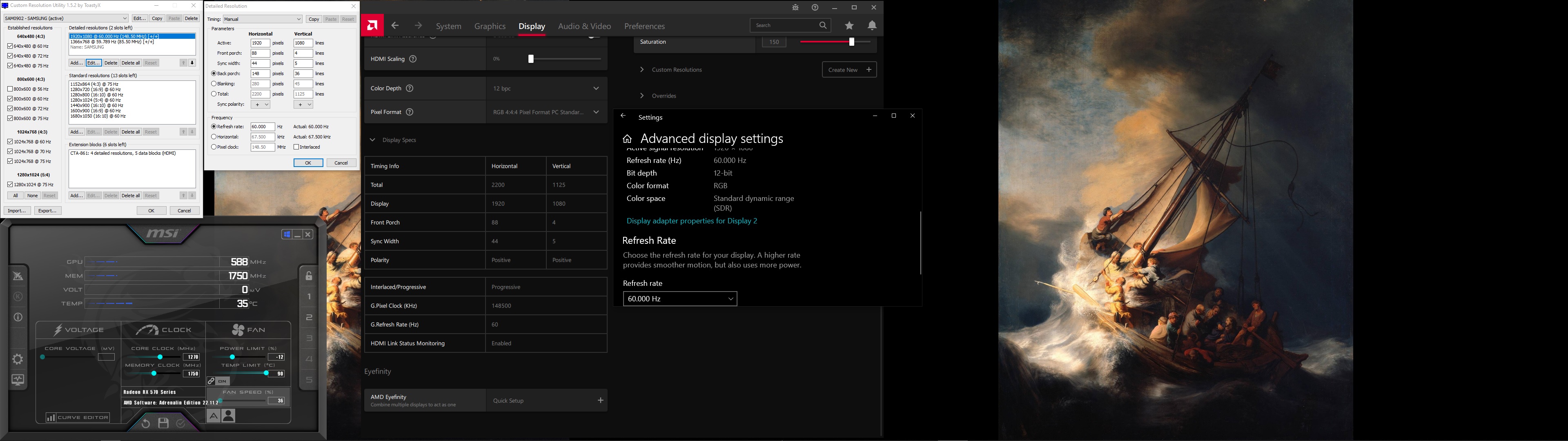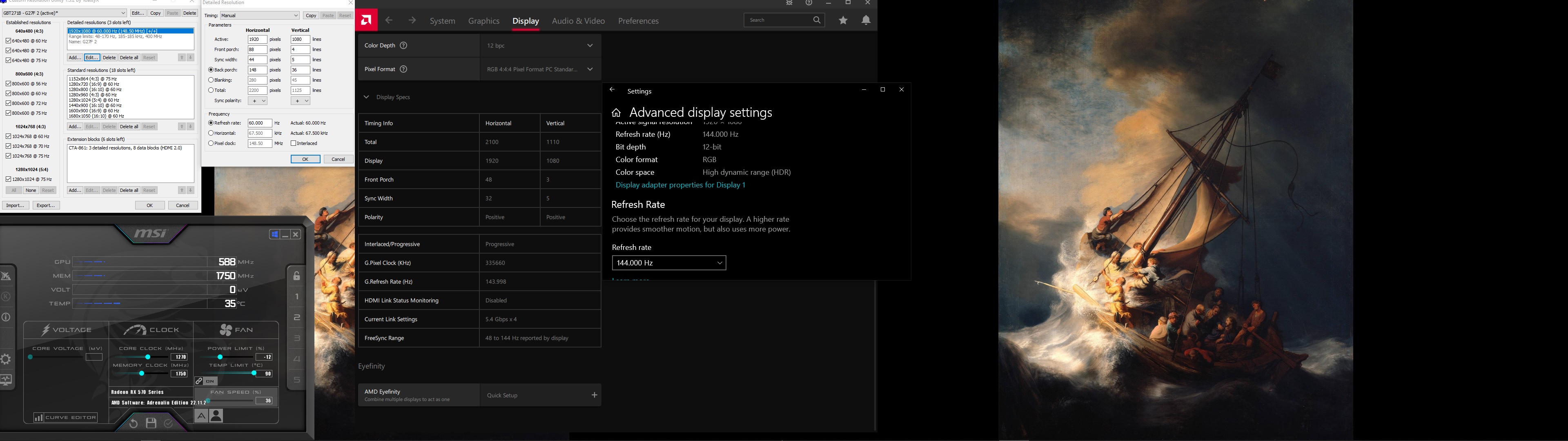 Since this is my first time with dual monitors and a semi high end PC (Samsung TV UN40EH5000G - Gigabyte G27F2 – RX570 8gb) I’ve never had this problem before. A 60hz FHD TV without Freesync through HDMI (2.0 I guess, It came with the G27F2 monitor) and a 165hz IPS FHD HDR ready monitor with Freesync through a Displayport 1.4 After setting it all up I find that my GPU’s core clock and memory are higher than usual while idle in desktop (usually 300 mhz – 300mhz. After dual setup, core 588mhz – mem maxed to 1750). Worried of course I started searching and reading until I found this place. Thanks for all the information provided, definitely a whole world. Even though I learnt a lot of new things I’m still new to this. I tried CRU settings for Automatic PC, CVT RB and manually changing vertical blanking and I was still unable to stabilize GPU clocks. Also when I tried CVT RB some spaces of the screen remained pure white. Having already disconnected the TV I was still trying to solve this Timing problem with the G27F 2. Finally I found a solution by creating a custom resolution with amd’s adrenalin. Lowering refresh rates to 142 and selecting CVTRB but I’d prefer to use CRU. Nevertheless the whole problem came back when I connected the TV back. I also deleted the custom resolution for the G27F2 until I can find a solution for both screens. I’m really worried because this means having the GPU’s mem all day maxed and with higher temperatures since I use this station for work and leisure. Not to even mention electricity costs and the obstacle to enjoy without worries my first high end monitor ever that was worth a lot for me. My name is Joaquin, I’m from Argentina and my career has nothing to do with technology. I’m just a 35 year old single lawyer with the quest of having the perfect FHD station My goal, if possible is to enjoy the best possible picture quality in the G27F2 with high refresh rates for gaming/movies and use the TV for seeing documents larger without having my gpu mem maxed all the time. Again thank you. |