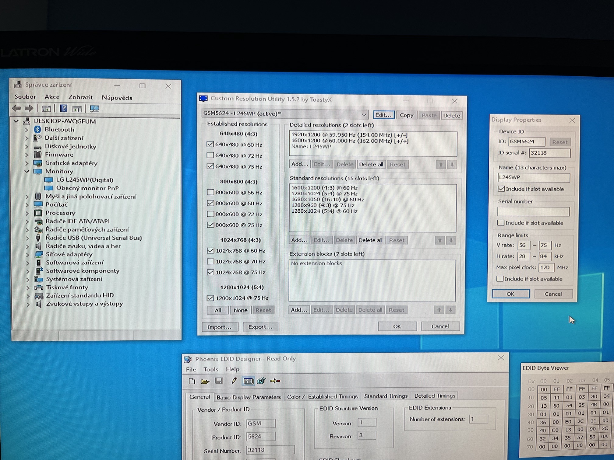 I just found out this great utility and I would like to ask you about some help as I don't know where to find the solution ![]() Display: - LG L245WP-BN (official LG drivers installed) connected to my miniPC via HDMI cable PC: - Intel NUC (CPU: i5-5250/8GB RAM/GPU: Intel HD Graphics 6000) with 64bit Windows 10 Pro I was trying to connect this old display to my miniPC but the whole screen is cropped/shifted as can be seen at attached photos. I was trying to check and overwrite the EDID of the display (EDID dumped via Phoenix EDID Designer) but as far as I know these problems are usually connected to NVIDIA GPUs. Anyway, I checked the EDID of the display in registry (regedit) but the table is very the same as the result from Phoenix EDID so there was nothing to change. When I launch the CRU, there are also no other extension slots that could be deleted. Do you have any idea how to solve this problem? I don't want to throw the display in the trash as it is basically OK ![]() Thanks a lot for your help! |