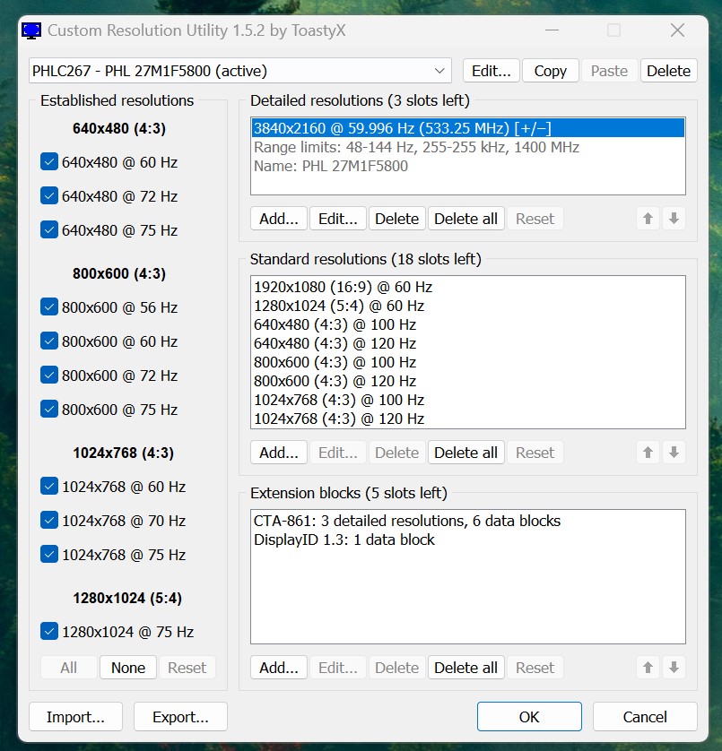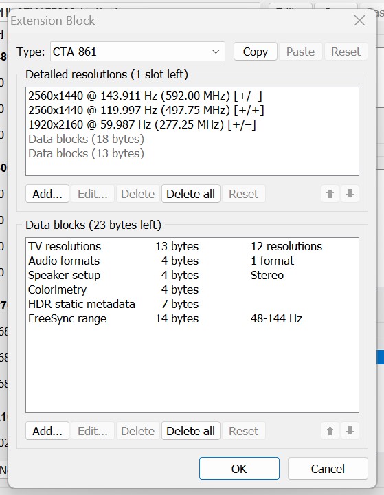 (03-09-2023 05:21 PM)Waldo Wrote: I'm having a problem with my Philips 27M1F5800. The monitor is capable of outputting 3840x2160 @ 144Hz, 120Hz, etc... but I can only find 3840x2160 @ 60Hz, and then a load of lower resolutions at 100Hz and 120Hz etc. I cannot find 3840x2160 @ 144Hz or 120Hz anywhere.They're in the DisplayID extension block. |